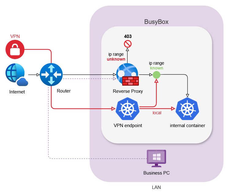 Der Zugriff auf die internen Container wird über eine Access List (Reverse Proxy) gesteuert. Immer wenn der Zugriff mit der eingetragenen Public IP des Kunden stattfindet, wird dieser als “bekannt” identifiziert und der Zugriff wird gestattet.
