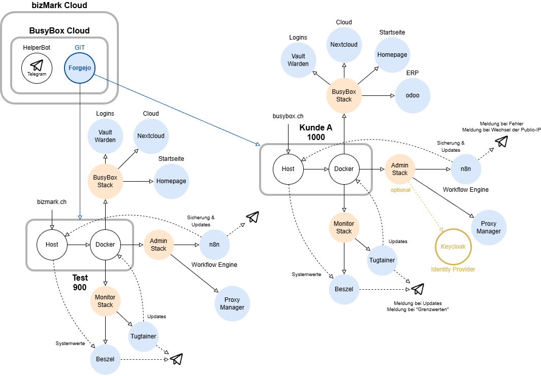 Um besser beschreiben zu können, wie die Kundensysteme provisioniert werden (Öko-System) und wie sie sich anschliessend autonom verhalten, wird mit dieser Skizze aufgezeigt. Eine BusyBox trägt stets die Mechanismen zur Aktualisierung in sich, jedoch birgt jedes Update ein Risiko auf Inkompatibilitäten. Daher werden Kundensysteme nur mittels Abo aktualisiert und überwacht.