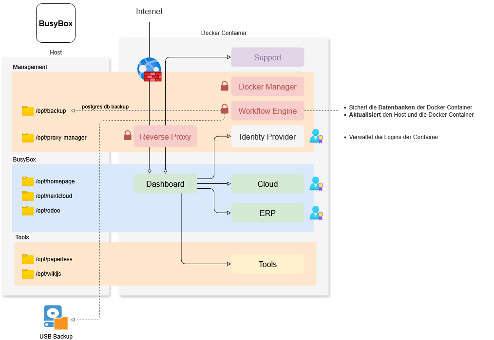 Die BusyBox ist ein modularer Mini-PC, der sämtliche geschäftsrelevanten Applikationen für KMU's bündelt – von CRM, Buchhaltung und Vertragsmanagement über Lagerverwaltung bis hin zu Reports und Automatisierungen. Dank einer zentralisierten Datenbankstruktur ermöglicht die Box nicht nur effizientes Datenmanagement, sondern auch den Zugriff via integriertem AI-Bot, der Antworten aus allen Unternehmensdaten liefert. Unser Produkt kombiniert Hardware, Software und Services in einem klar skalierbaren Geschäftsmodell: